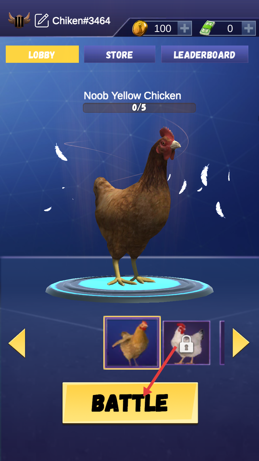 1、点击【BATTLE】开启对战,选用【Noob-Yellow-Chicken】初始角色,熟悉操作后冲击更高排名。