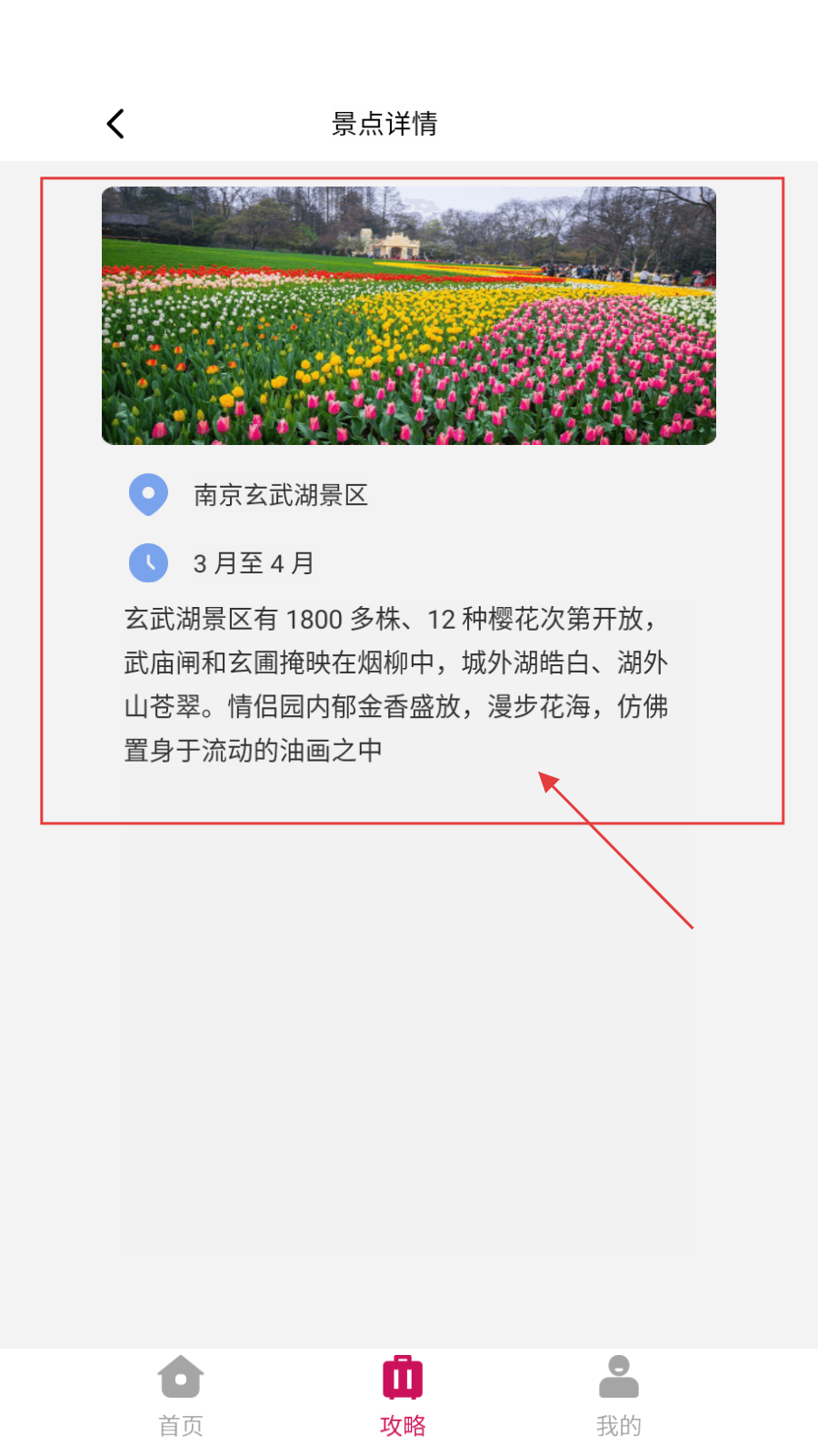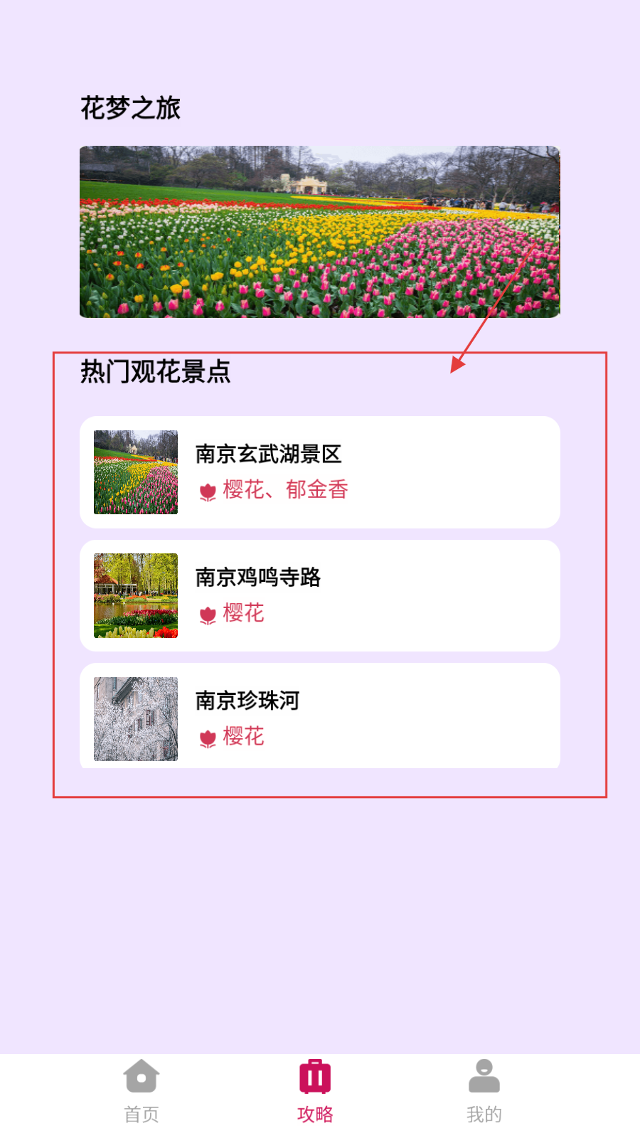 1、在攻略页,选热门观花景点(如南京玄武湖景区),查看可赏花卉。