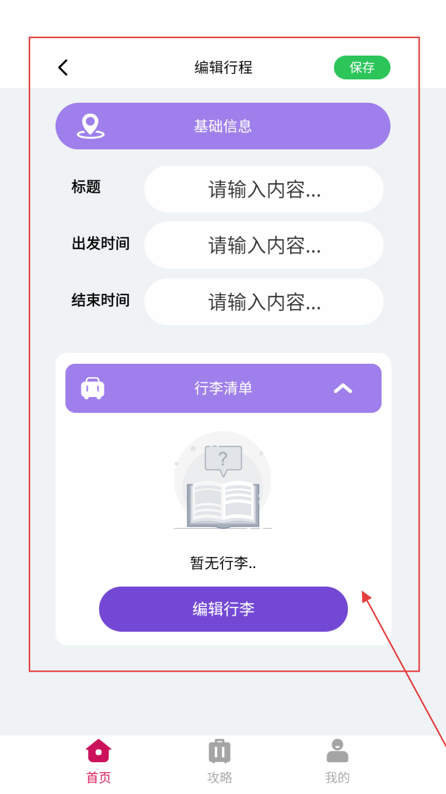 4、填行程标题、时间,编辑行李清单,保存定制观花行程。