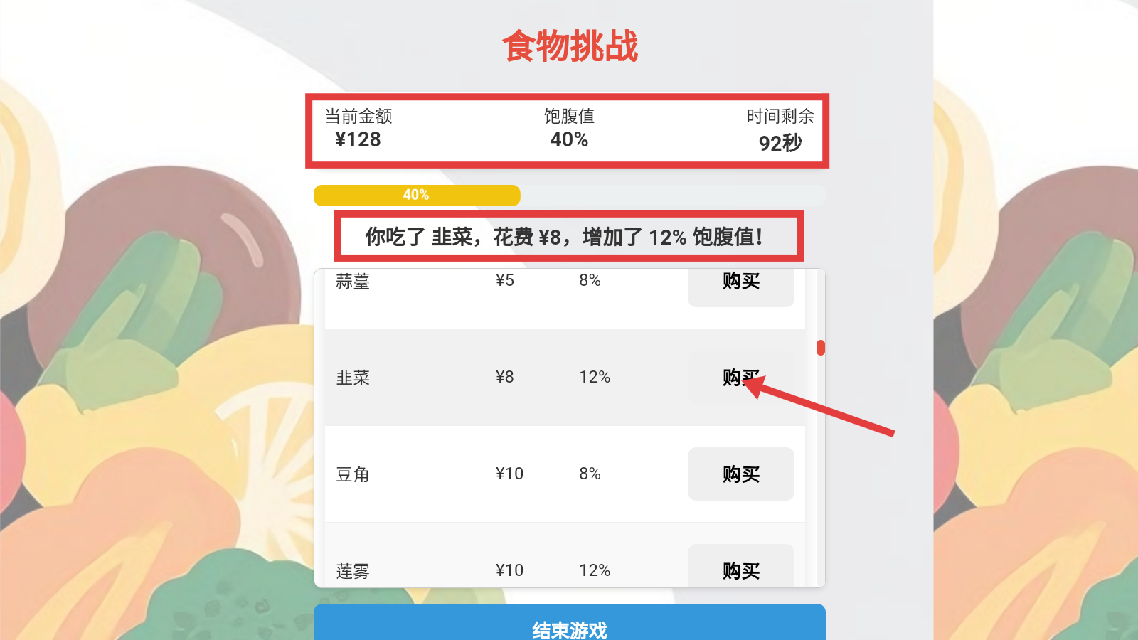 2、策略深度考验:权衡食物价格与饱腹值比例,优化选购方案突破预算限制,实现高效资源利用和分数最大化。
