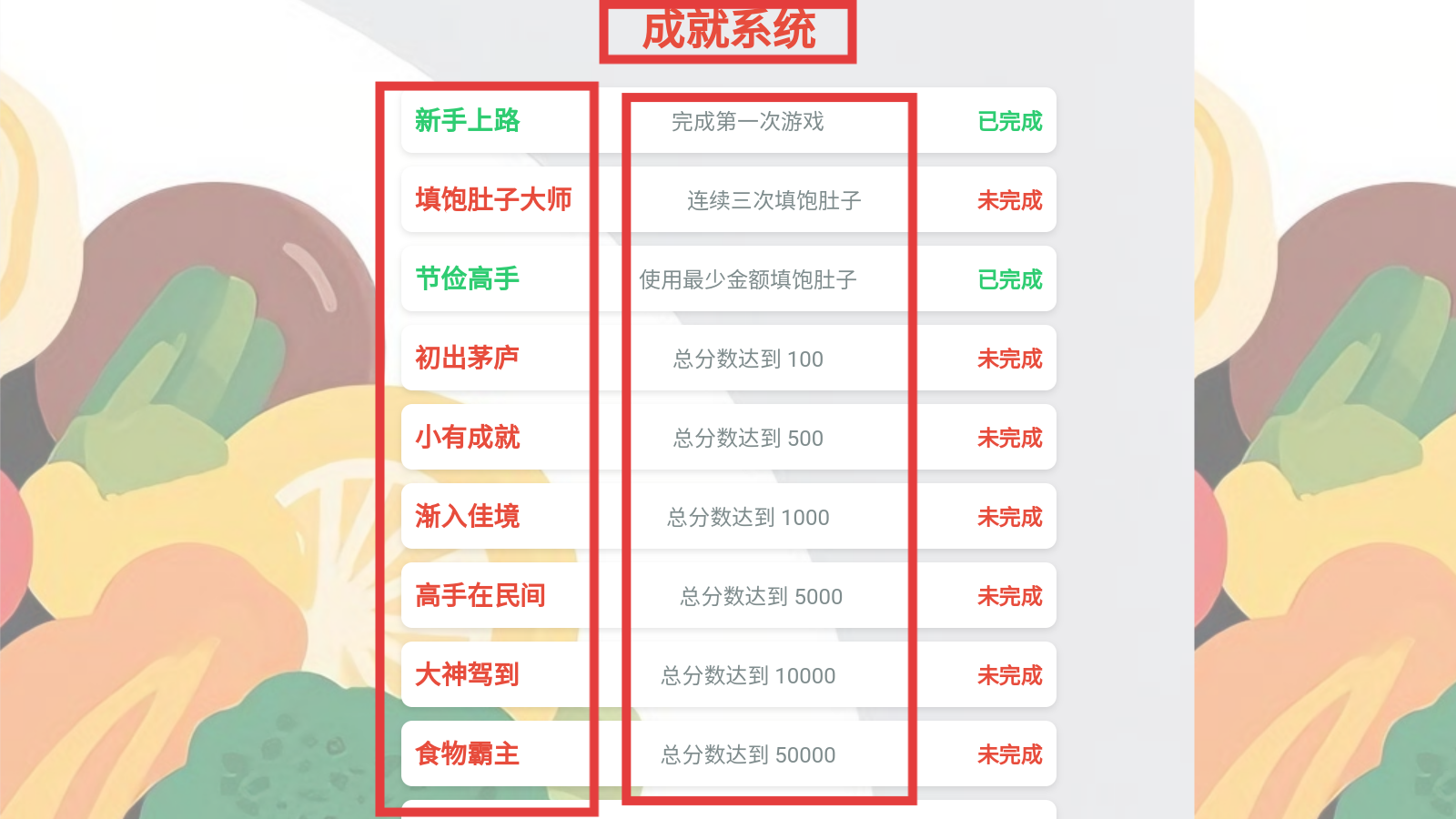 4、进入【成就系统】,瞄准【填饱肚子大师】等目标,规划分数,重复挑战解锁成就。