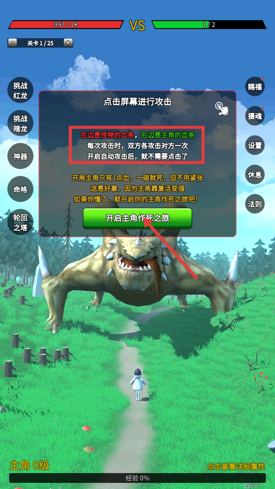 1、点击【开启主角作死之旅】,明确血条机制,攻击时双方互攻,开启自动攻击简化操作。
