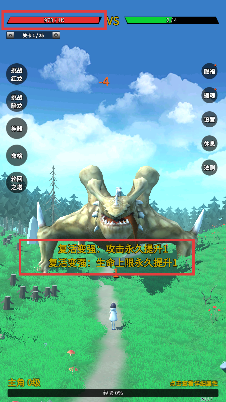 2、复活触发【攻击永久提升1】【生命上限永久提升1】,反复挑战,借死亡积累属性强杀怪物。