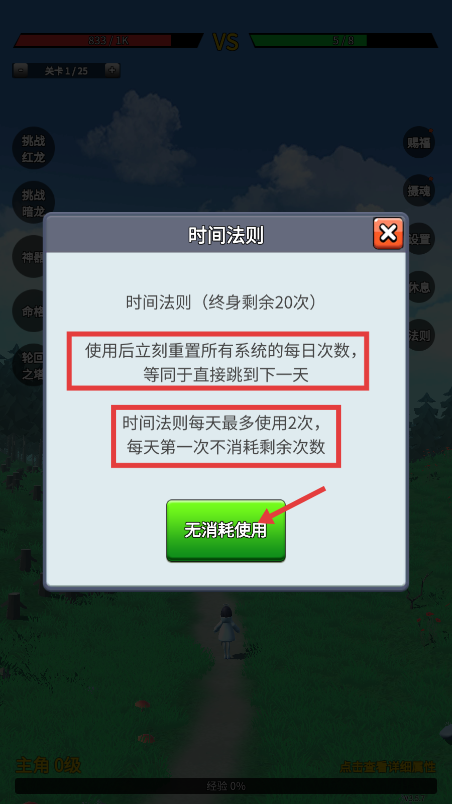 3、活用【时间法则】,每日首次无消耗重置系统次数,跳转新天数,高效刷取资源道具。