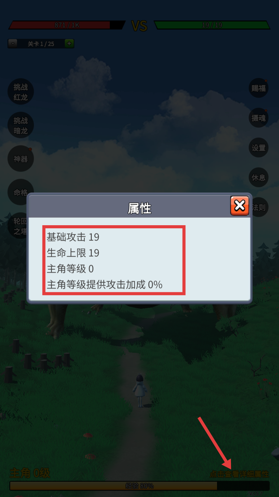 4、点【查看详细属性】,掌握基础攻击-19、生命上限-19等数据,依等级加成规划养成方向。