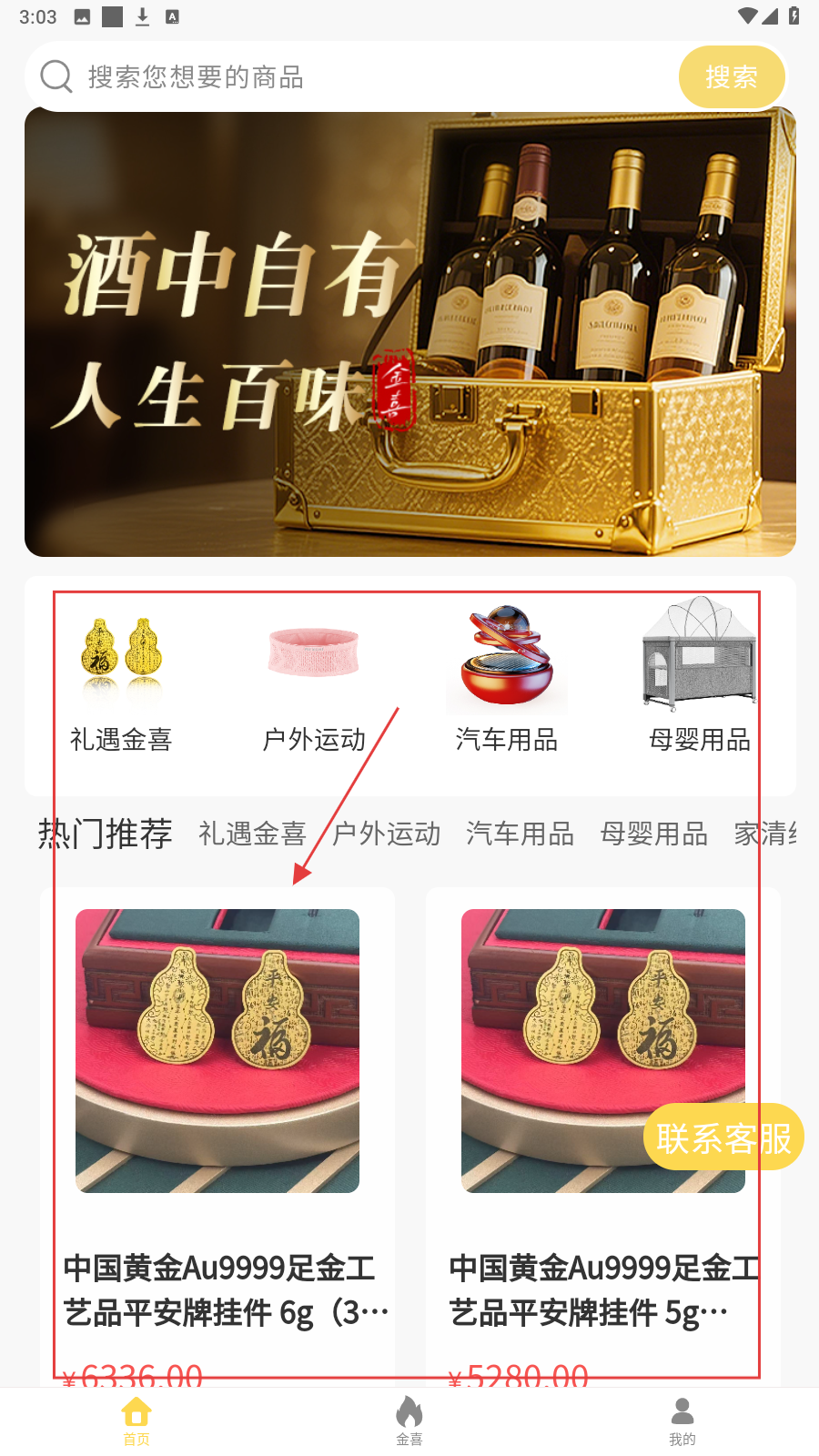 1、进入首页,按需选分类,如【礼遇金喜】,浏览对应商品开启购物。
