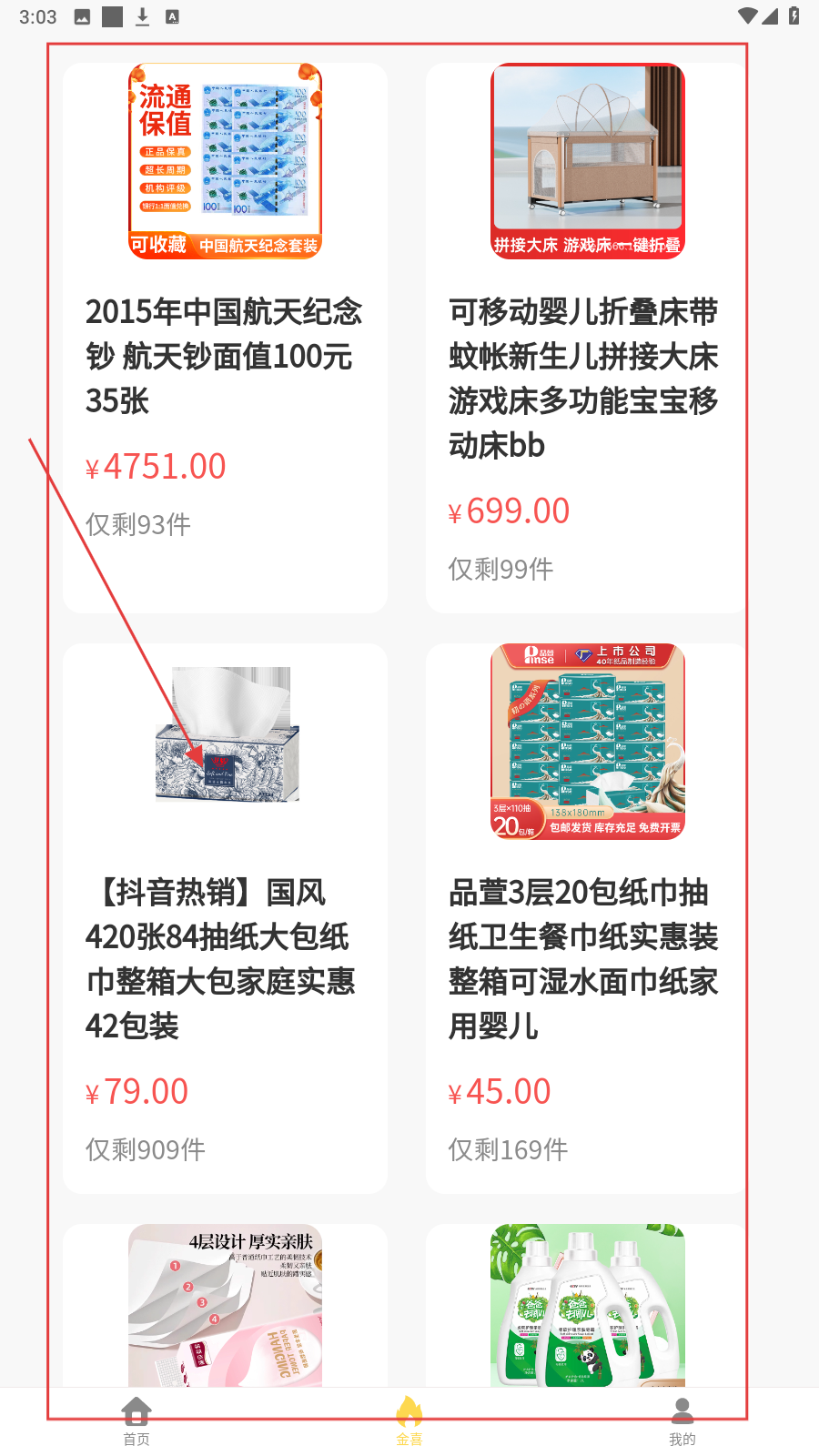 3、切【金喜】页,浏览航天纪念钞、婴儿床等特色商品,点击心仪商品进入详情页。