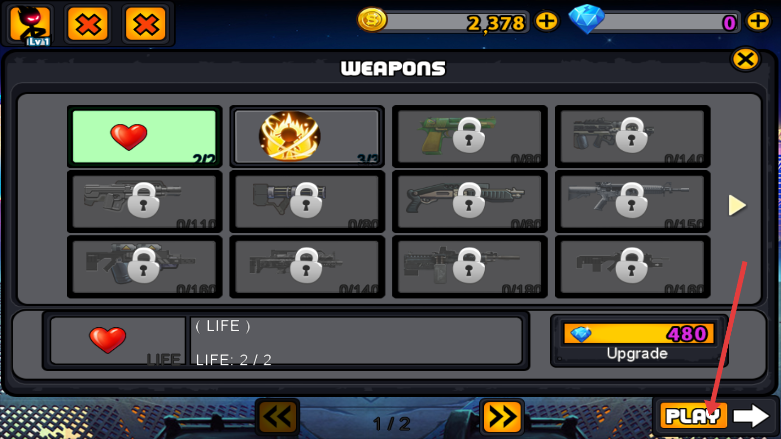 1、武器界面选解锁道具(如爱心、火焰),点击【PLAY】,开启街头战斗。