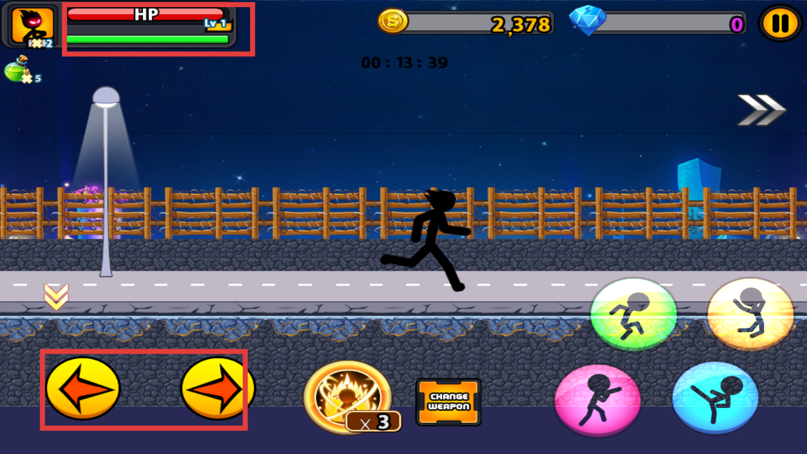 2、左侧【←→】控移动,紧盯左上角【HP条(Lv1)】,维持生存血量。