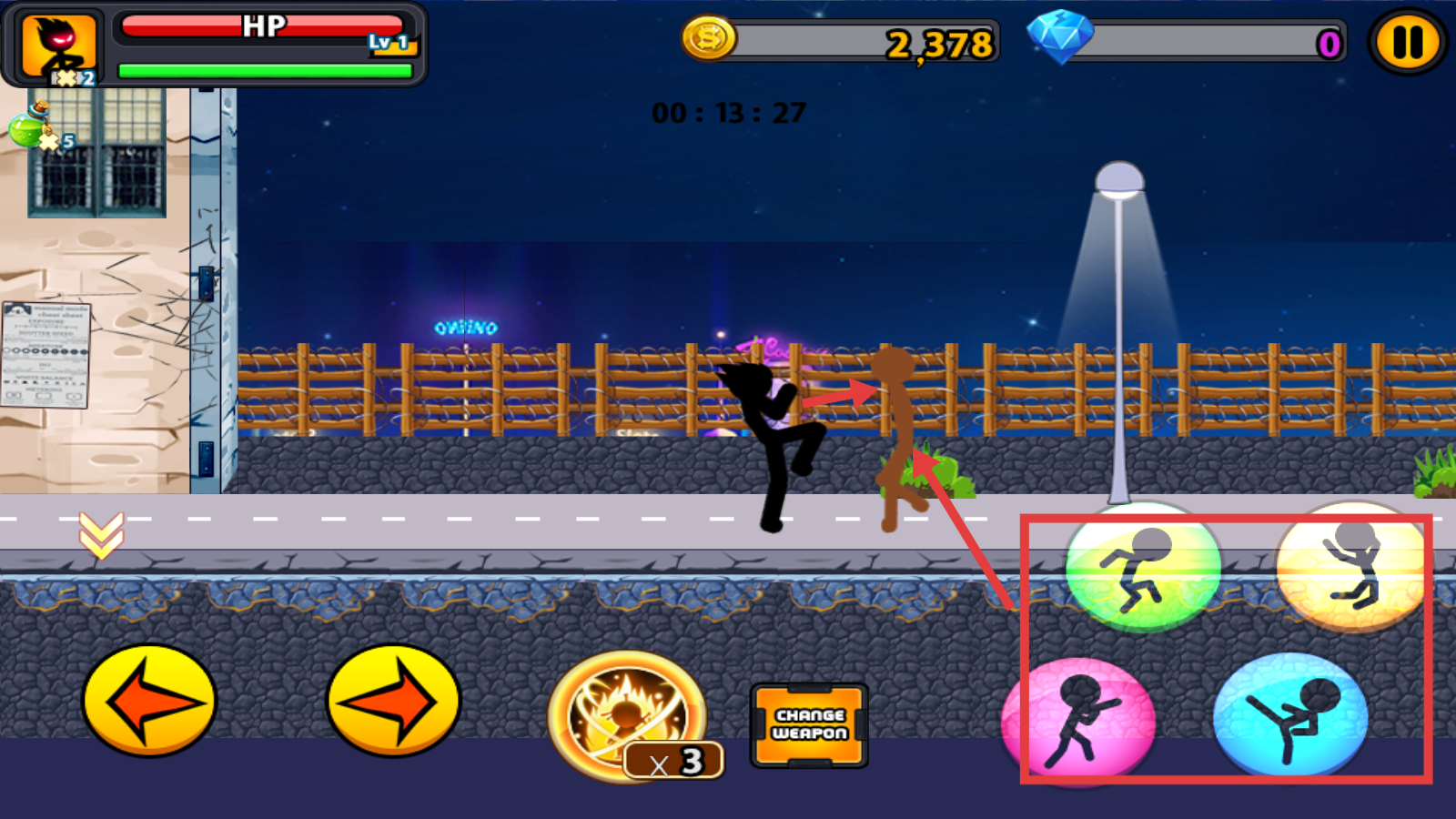 3、遇敌时触发右侧【跑/拳/射/踢】技能,连招击溃棕色火柴人敌人。