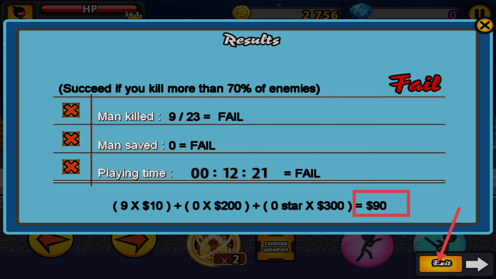 4、结算页领取战斗金币(如$90),点【Exit】返回,积累资源强化战力。