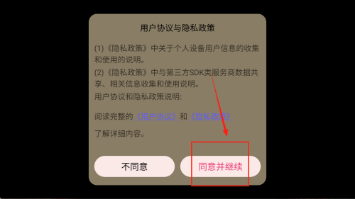 2、阅读《用户协议与隐私政策》后点击“同意并继续”接受条款。