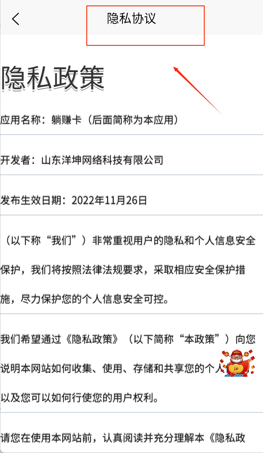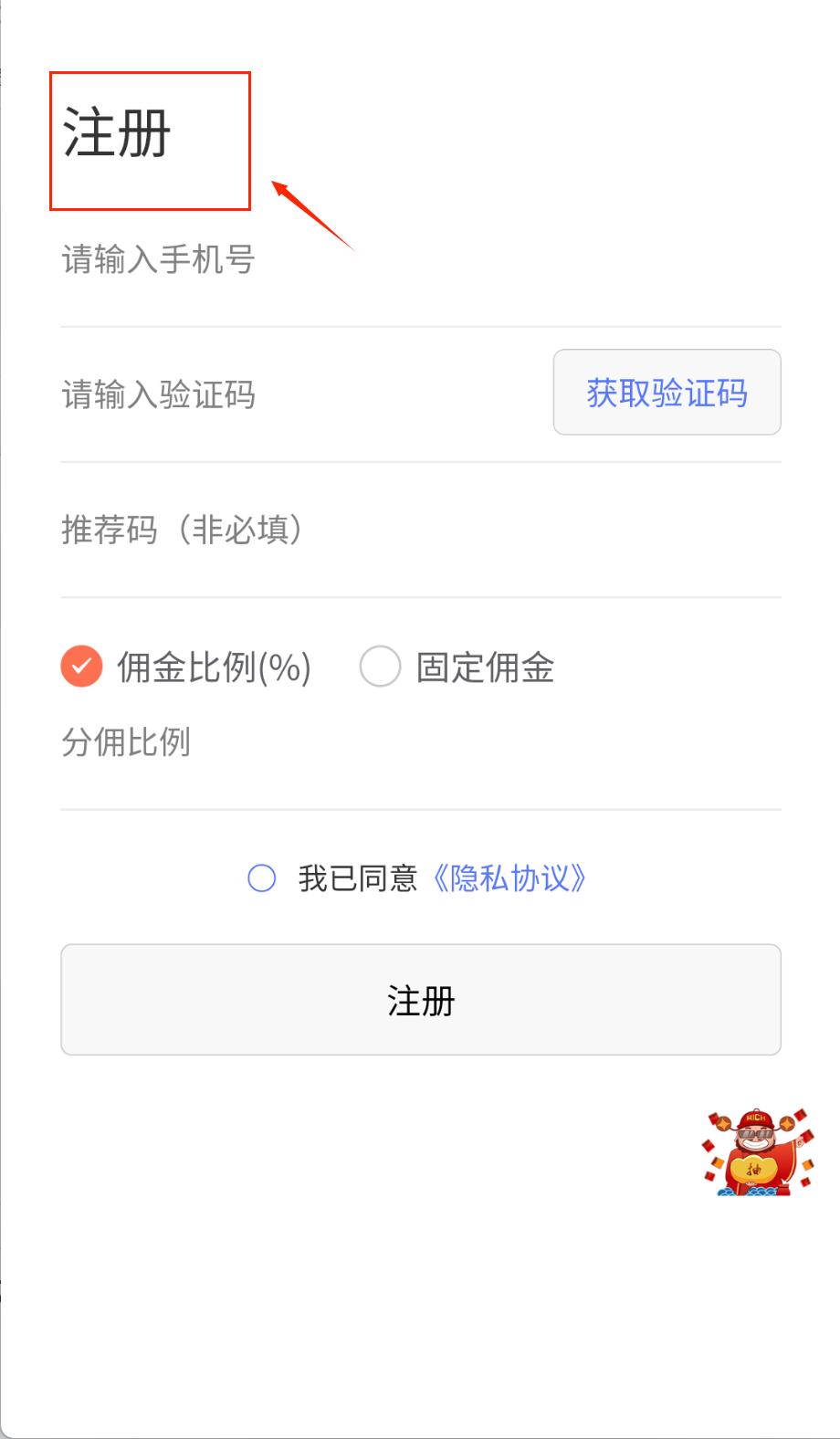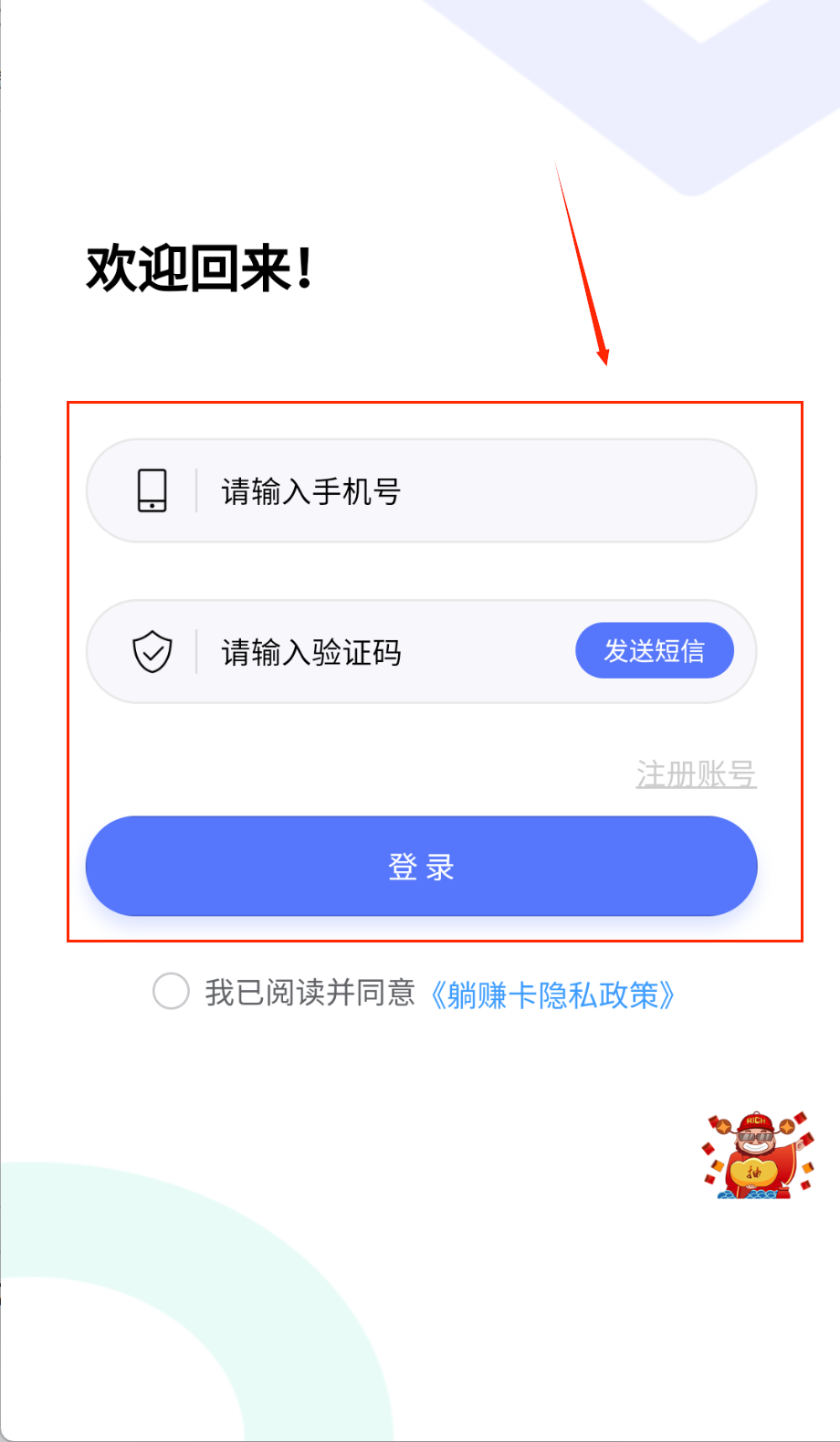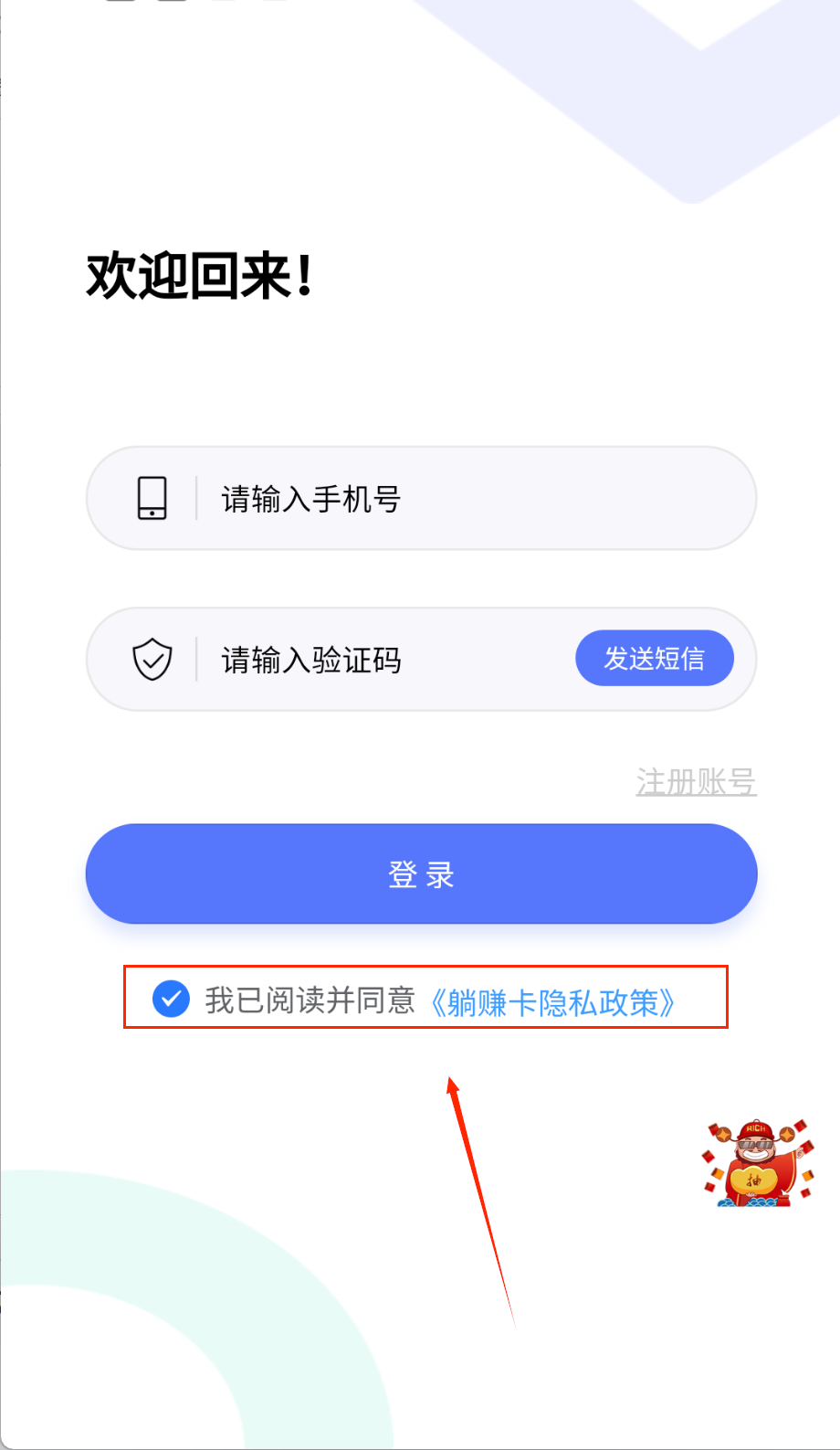 4 、不管是注册还是登录,都要勾选同意隐私政策那个小方框,这样才能正常使用软件功能,右下角小财神图案看着还挺喜庆的。