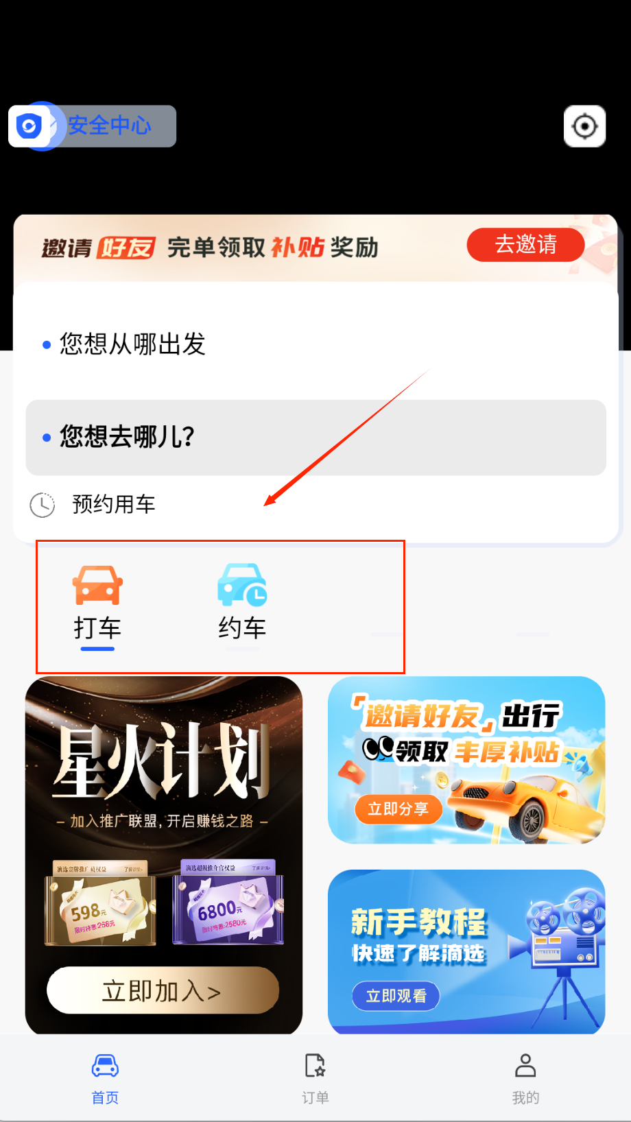 1、下载安装后首先开启定位权限,系统会自动识别当前位置。在首页输入目的地地址,选择需要的车型和乘车人数。