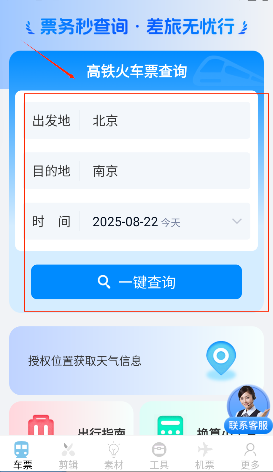 1、打开应用后首先选择查询类型,可切换火车票或机票查询模式。输入出发城市、到达城市和出行日期等基本信息。
