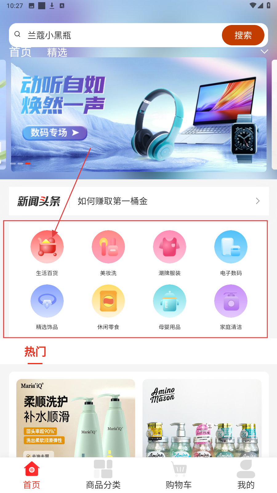 1、首页选分类,如【生活百货】,进入找对应商品品类。