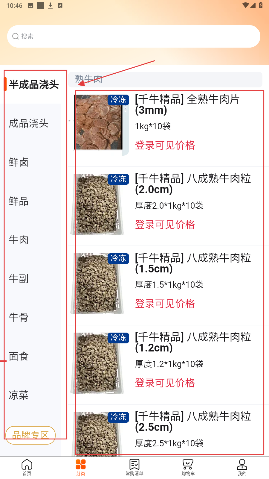 4、切换分类至牛肉等,选如【千牛精品全熟牛肉片】了解详情。