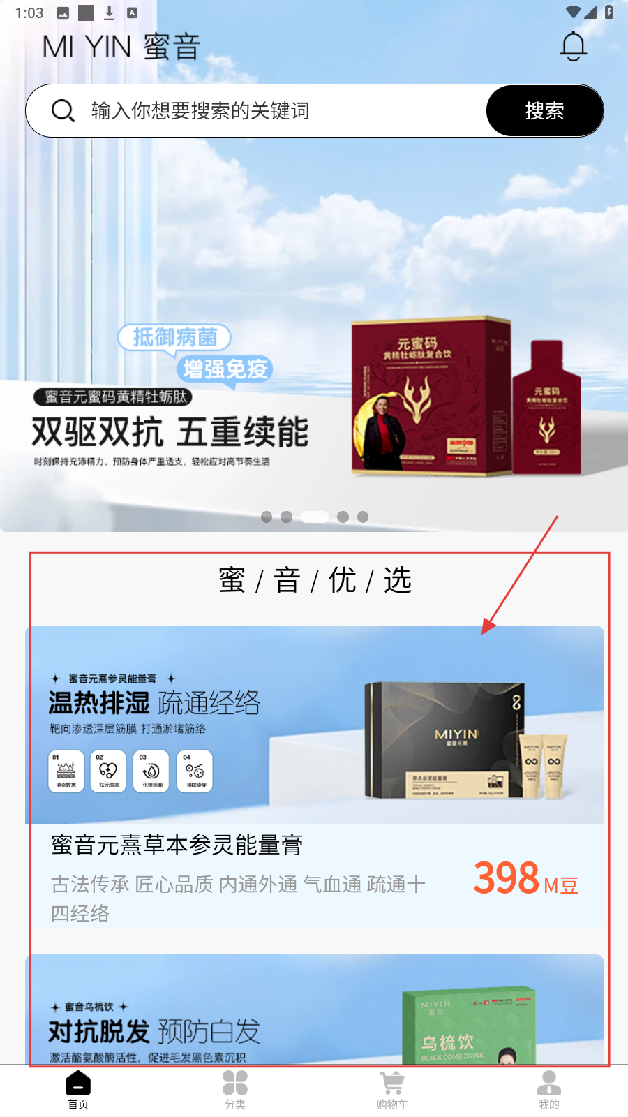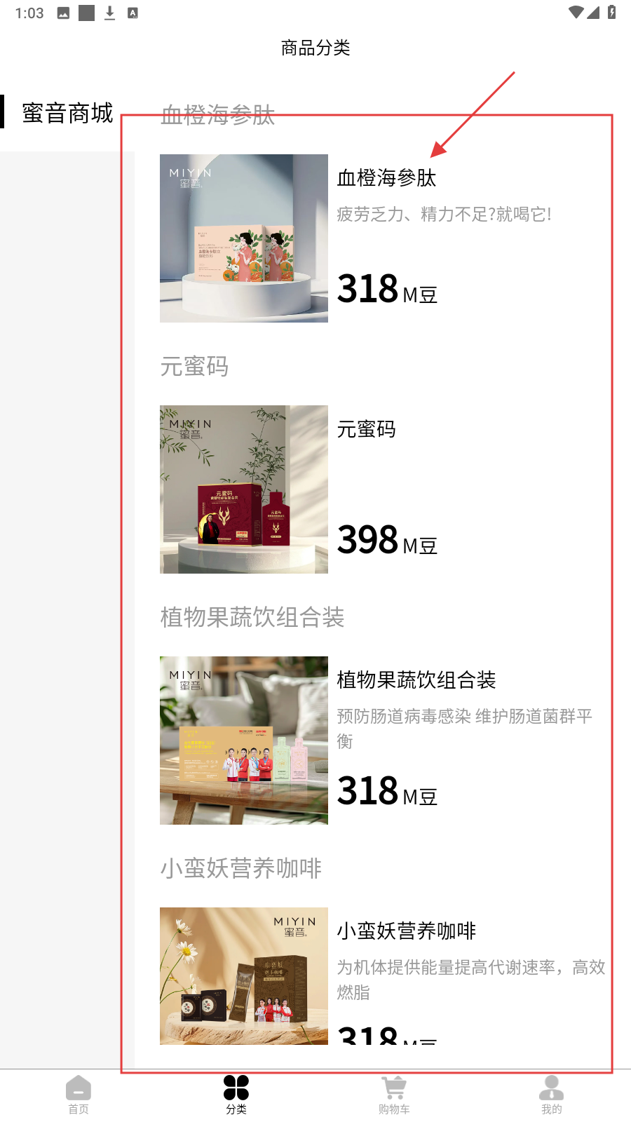 3、切换【分类】页,逛蜜音商城,选血橙海参肽等商品了解。