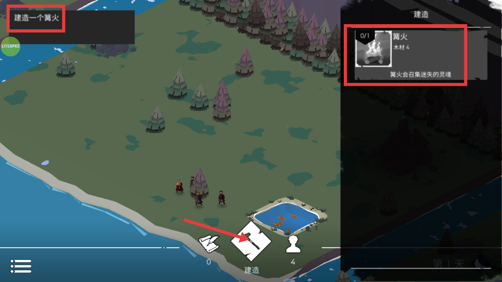 2、接取【建造一个篝火】任务,收集【木材-4】,通过建造按钮完成篝火,解锁召集灵魂功能。