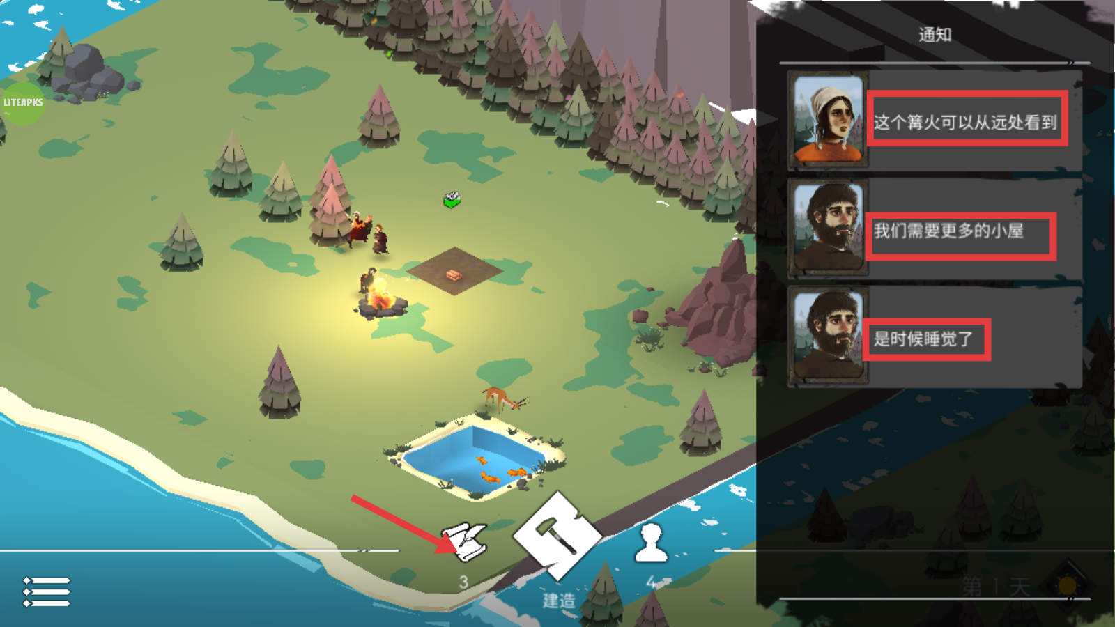 4、关注通知栏需求,如【篝火可见-小屋需求-睡觉提示】,优先满足建筑与休息需求,推进基地发展。