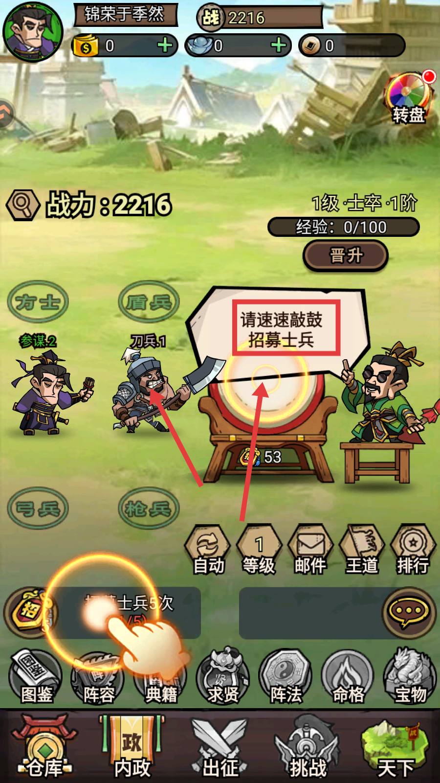 1、主界面响应【敲鼓招募】提示,点击招募按钮,快速扩充士兵阵容提升初始战力。