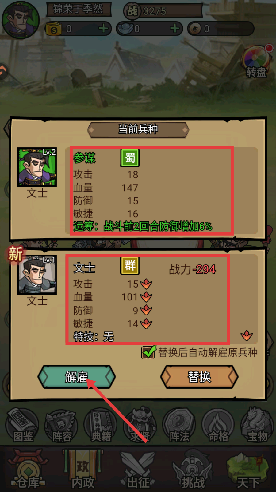 2、兵种界面对比【参谋-文士】属性,解雇低战文士,通过替换优化部队战斗能力。