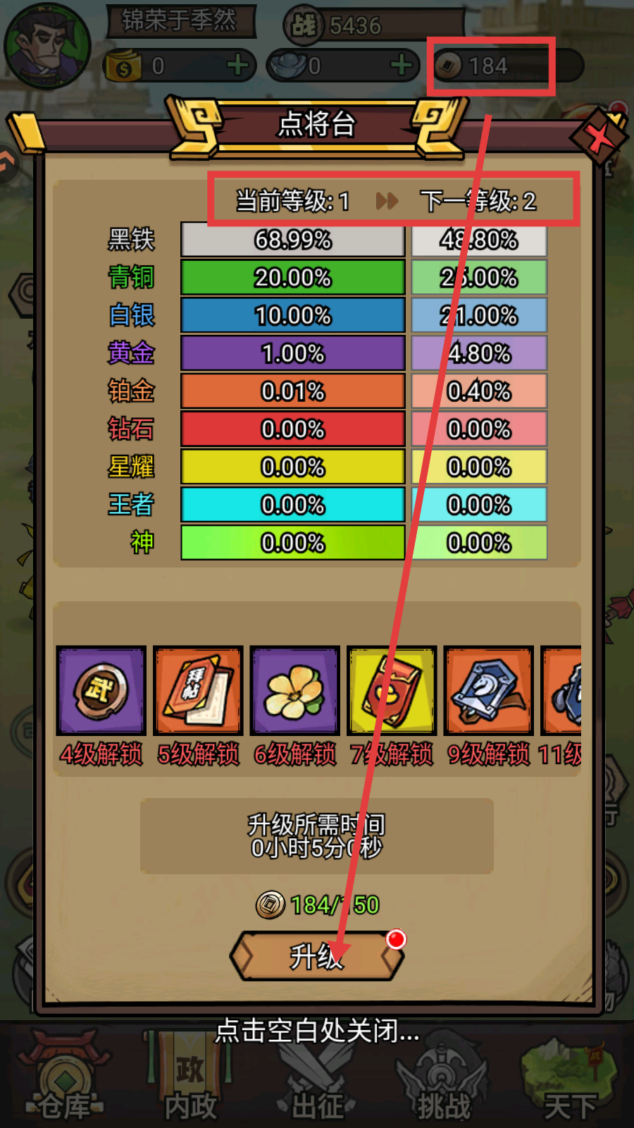 3、点将台消耗【铜币-184/150】升级,从1级升2级,解锁更高品质士兵招募概率。