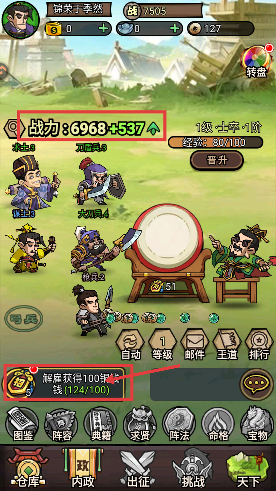 4、解雇士兵获【100铜钱】,战力升至【6968+537】,积累资源同时推进养成进度。
