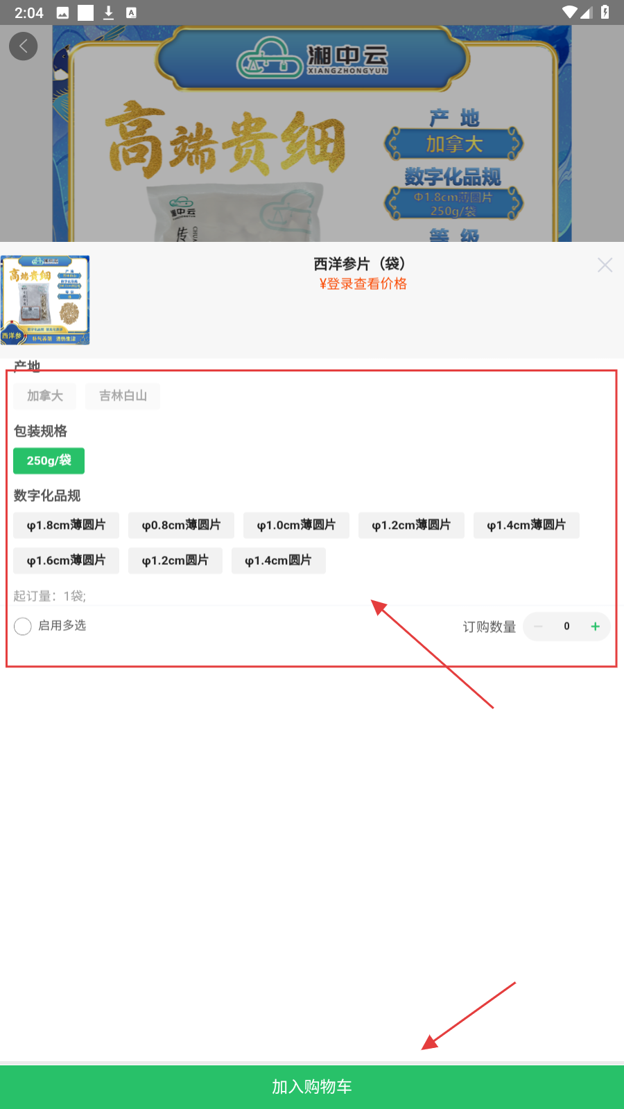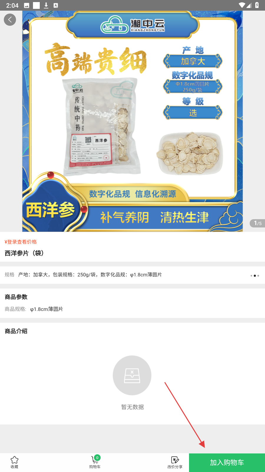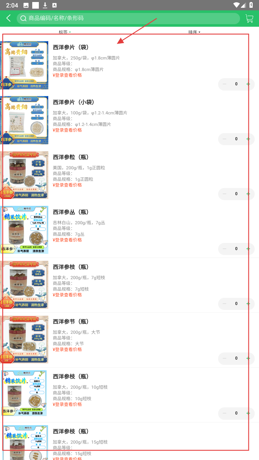 2、在商品列表页,选西洋参片(袋)等商品,查看详情。