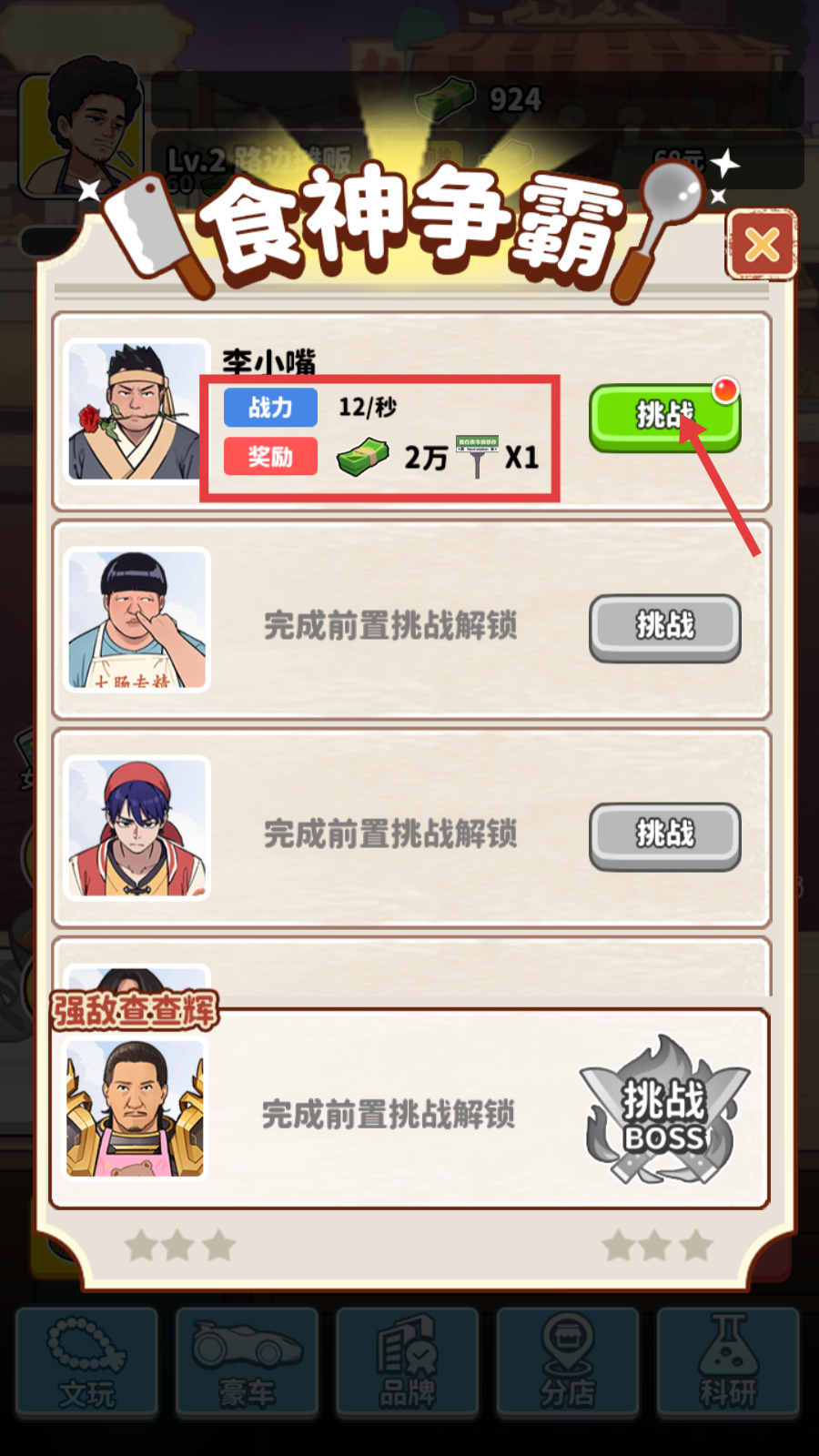 2、选择【李小嘴-战力12/秒】,点击绿色【挑战】键,战胜可获【2万-道具】奖励。