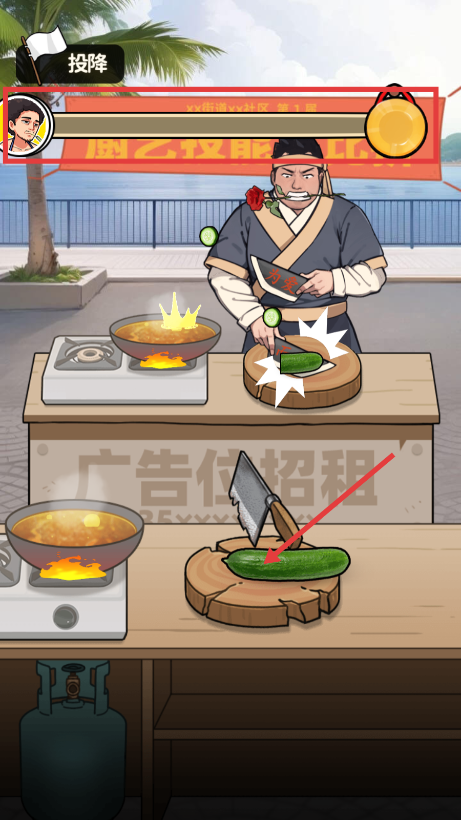 3、厨艺对决时,观察对手(切黄瓜)操作,利用灶台烹饪,推进比赛进度争夺胜利。