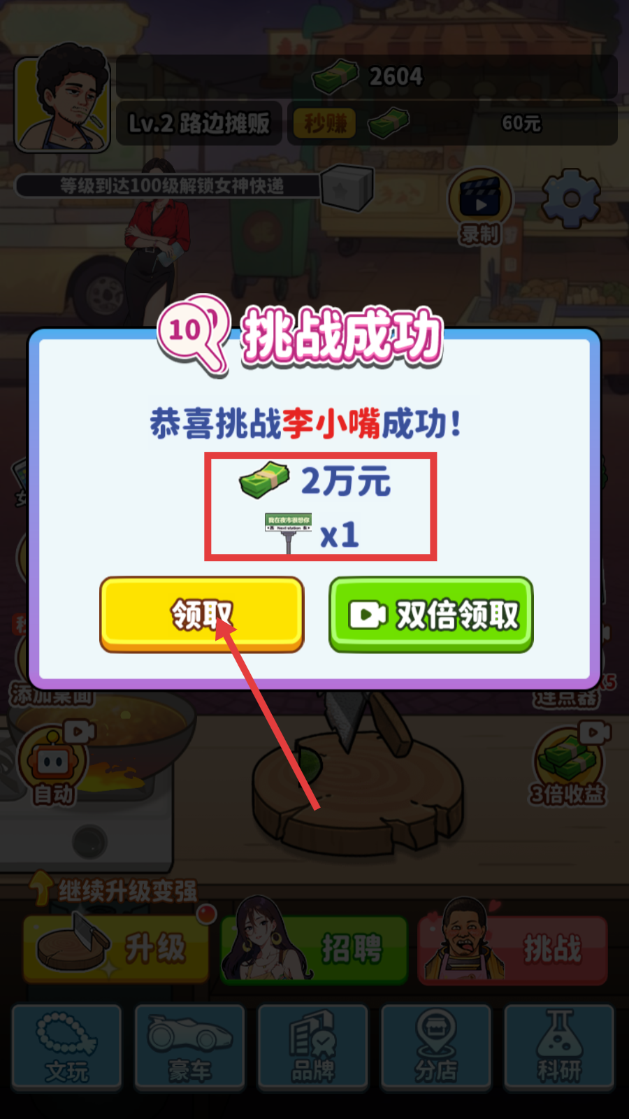 4、挑战成功后点击【领取】,获取【2万元】奖励,积累资金助力摊位升级或招聘。