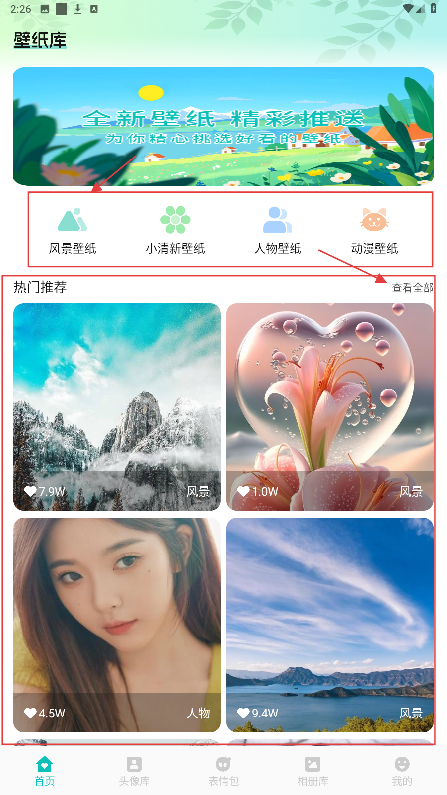 1、进入壁纸库,可从【风景壁纸】【小清新壁纸】等分类快速找心仪壁纸,也能逛【热门推荐】挑热门款。