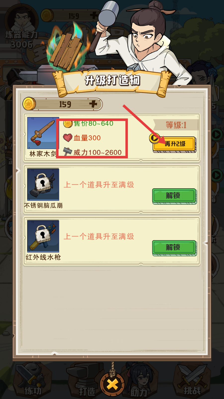 1、点击【再升2级】提升【林家木剑-血量300-威力100~2600】属性,消耗金币强化打造物战力。