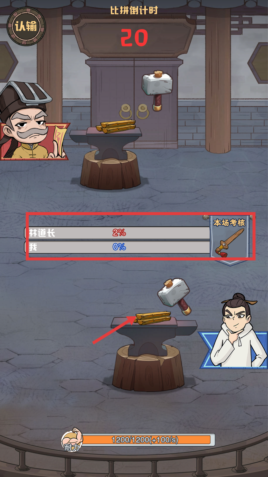 3、比拼倒计时内,快速点击锤子加工木料,追赶【林道长-2%】进度,争夺考核胜利。