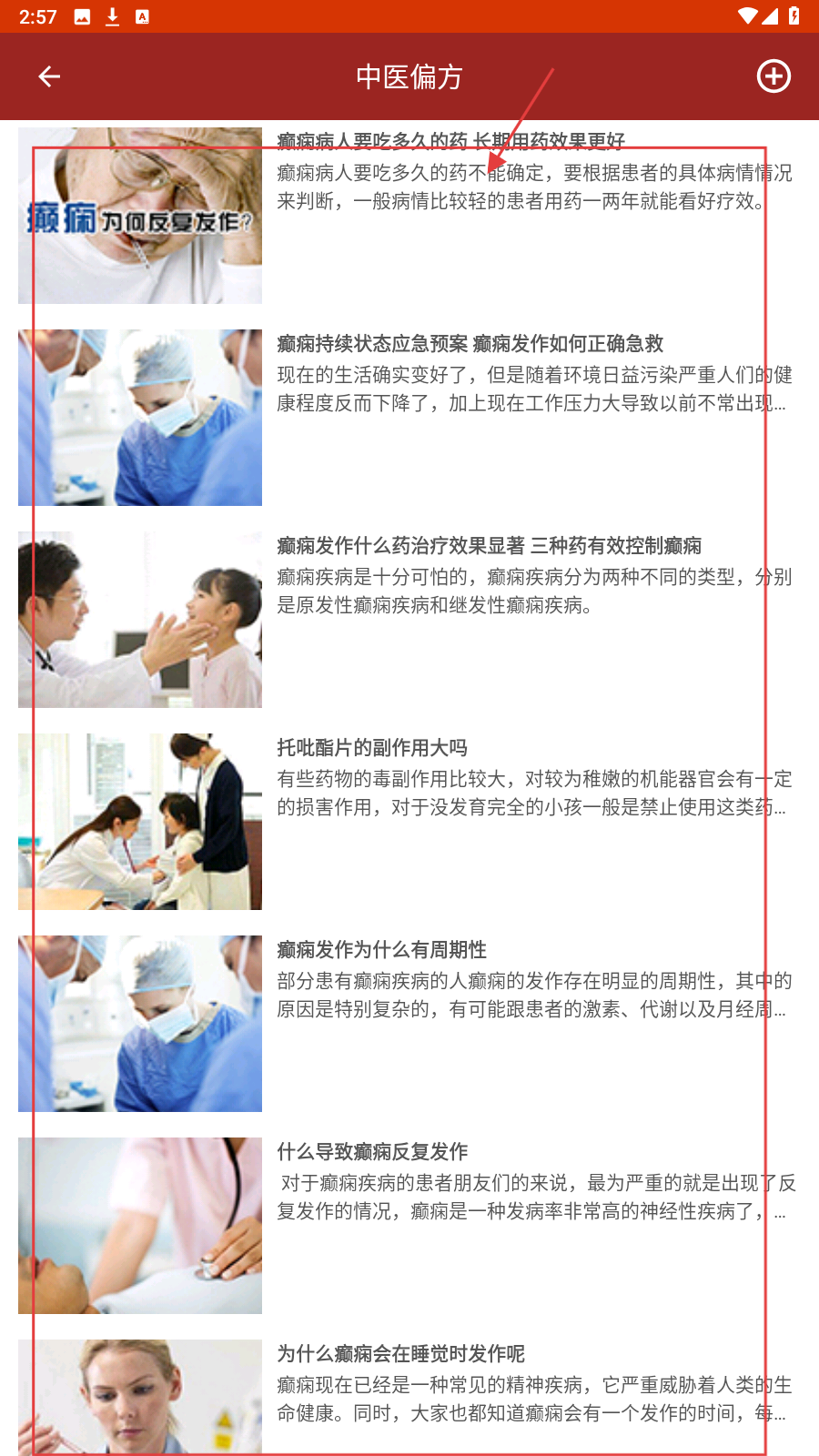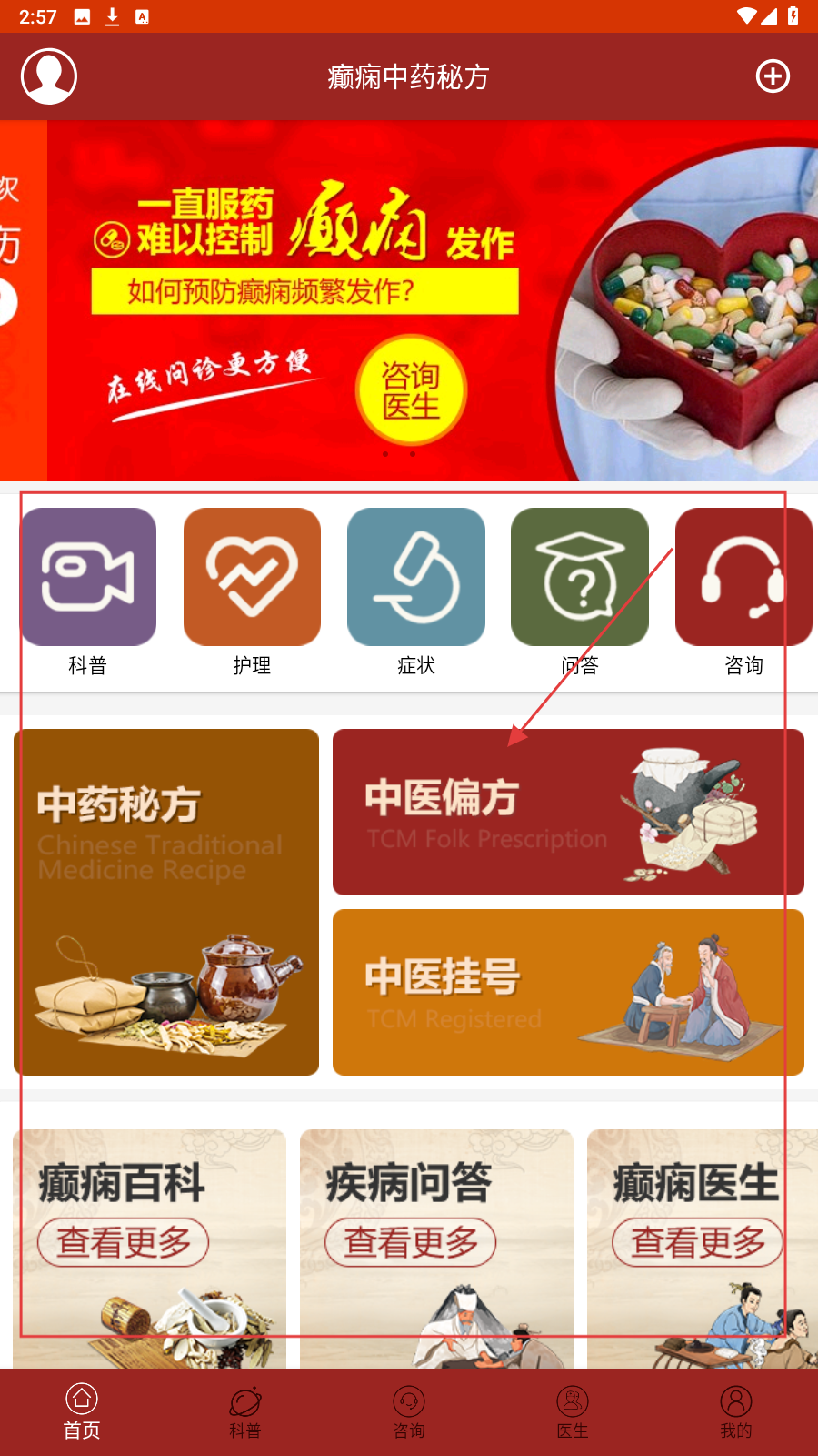 1、进入【癫痫中药秘方】,按需选功能(如中医偏方),点对应入口了解内容。