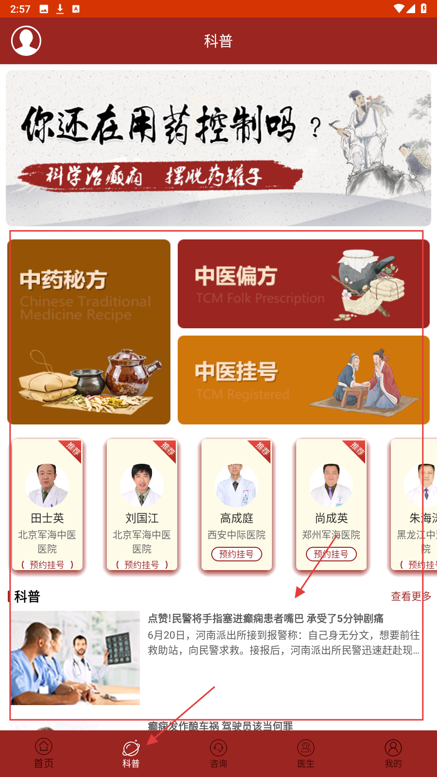 4、到【科普】页,选服务(如中医挂号)或读科普文章,了解癫痫知识。