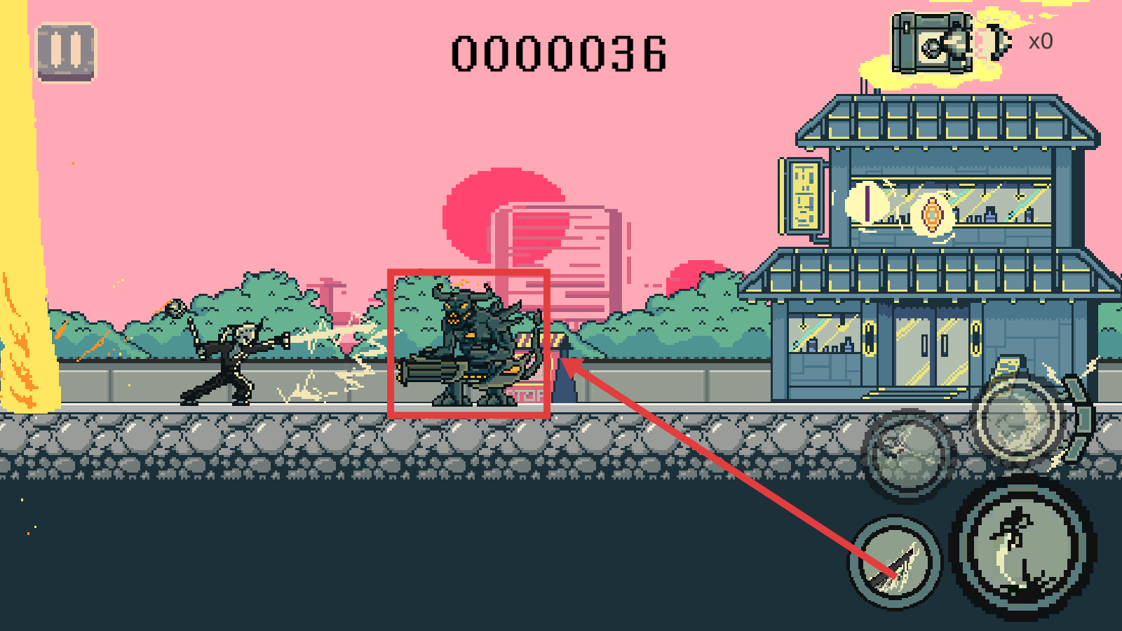 2、右侧技能键控制攻击/闪避,操控角色沿日式街道向右推进。