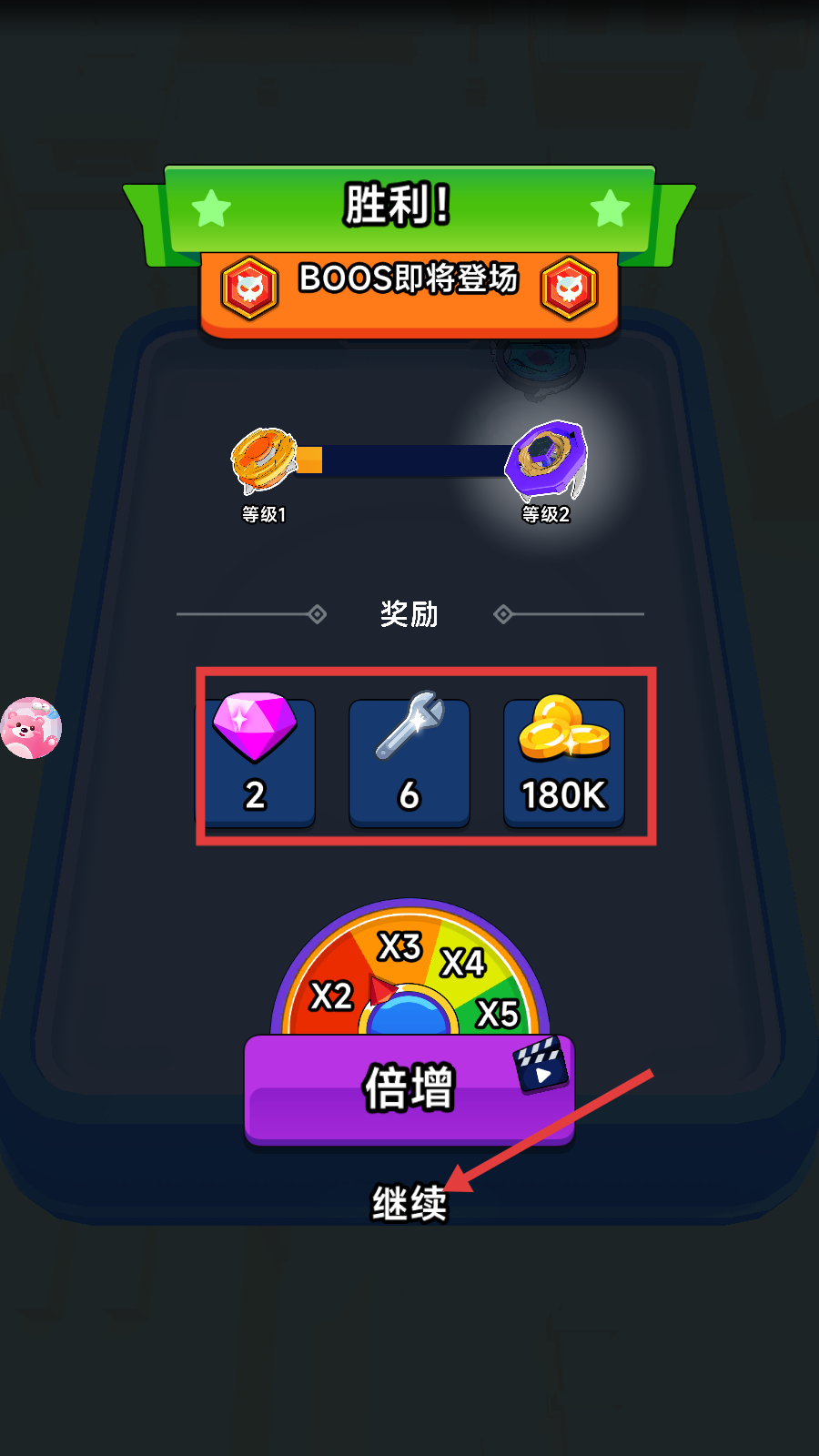 4、胜利后领取【钻石2、扳手6、金币180K】,点击【继续】推进游戏。
