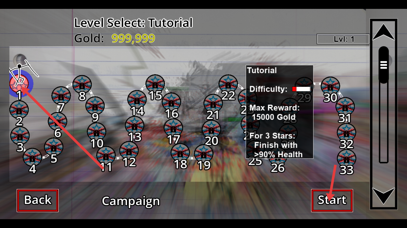 1、在关卡选择页,点击标有【1】的圆形图标(教程关),再点右下角【Start】进入第1关。