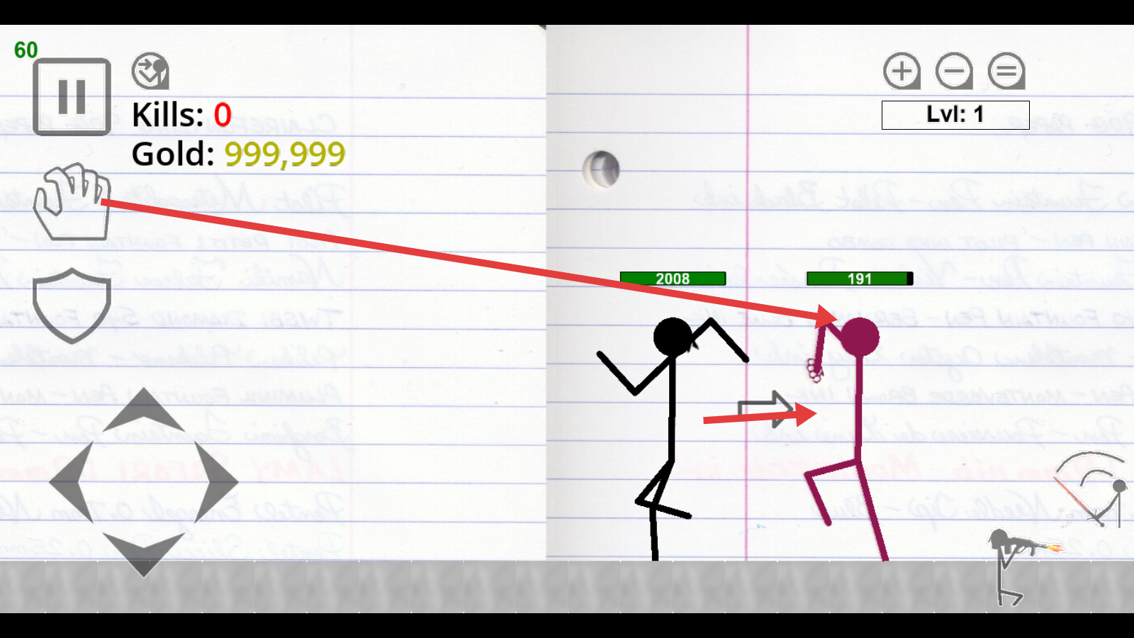 3、点击左侧手型技能图标,操控角色攻击紫色敌方火柴人(血量191),积累击杀数。