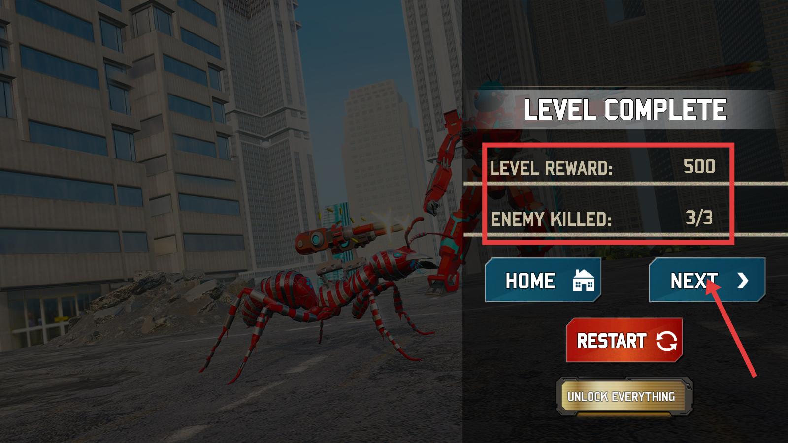 4、消灭3个敌人后,结算界面显示「LEVELREWARD:500」,点击「NEXT」推进关卡。
