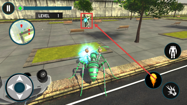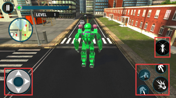 2、左侧方向摇杆控制绿色机甲移动,右侧技能键(含变身、攻击等)释放技能,关注上方血量条。
