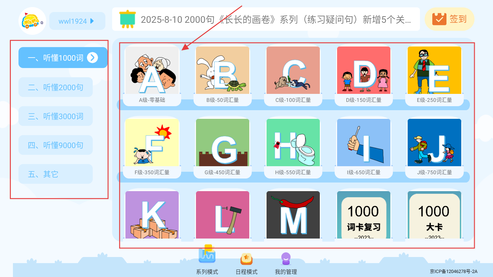 1、进入应用,选左侧模块(如听懂1000词),再点右侧分级关卡(如A级-零基础),开启词汇学习。