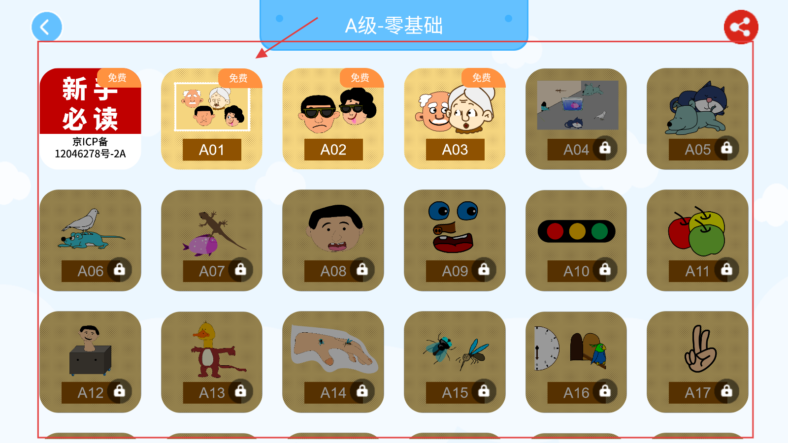 2、在A级-零基础页,选免费关卡(如A01),进入学习,解锁基础词汇内容。