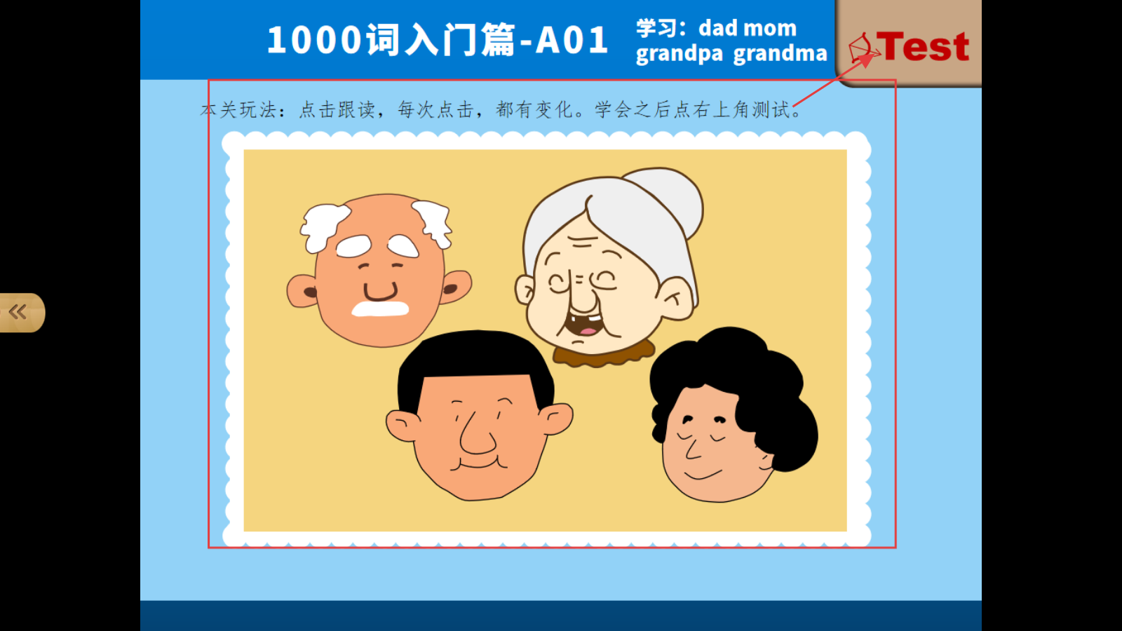 3、学A01关卡,点击跟读【dad】【mom】等词汇,按玩法操作,学会后点右上角测试。