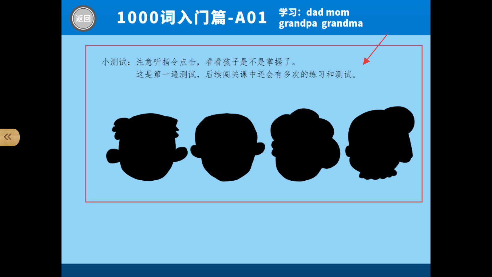 4、完成跟读,参与小测试,听指令点对应头像,通过测试巩固词汇,继续闯关。
