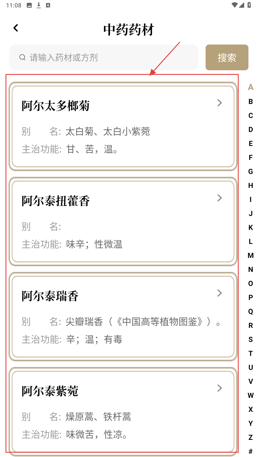 2、在【中药药材】页,浏览药材(如阿尔太多榔菊),点选查别名、主治功能,学药材知识。