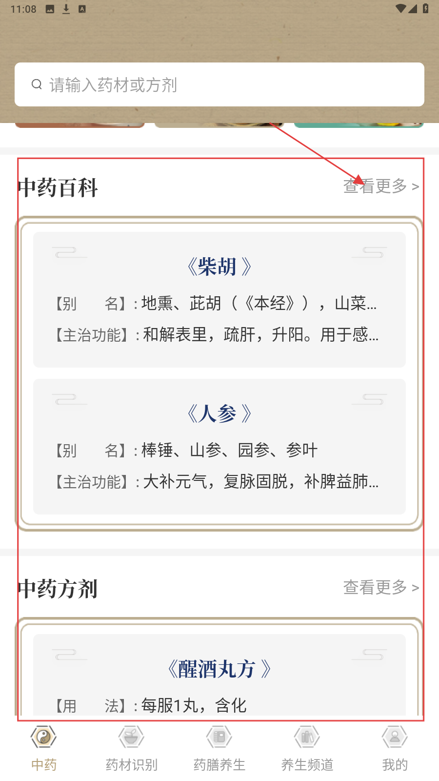 3、到【中药百科】区,点【查看更多】,看药材(如柴胡)、方剂(如醒酒丸方),拓展知识。