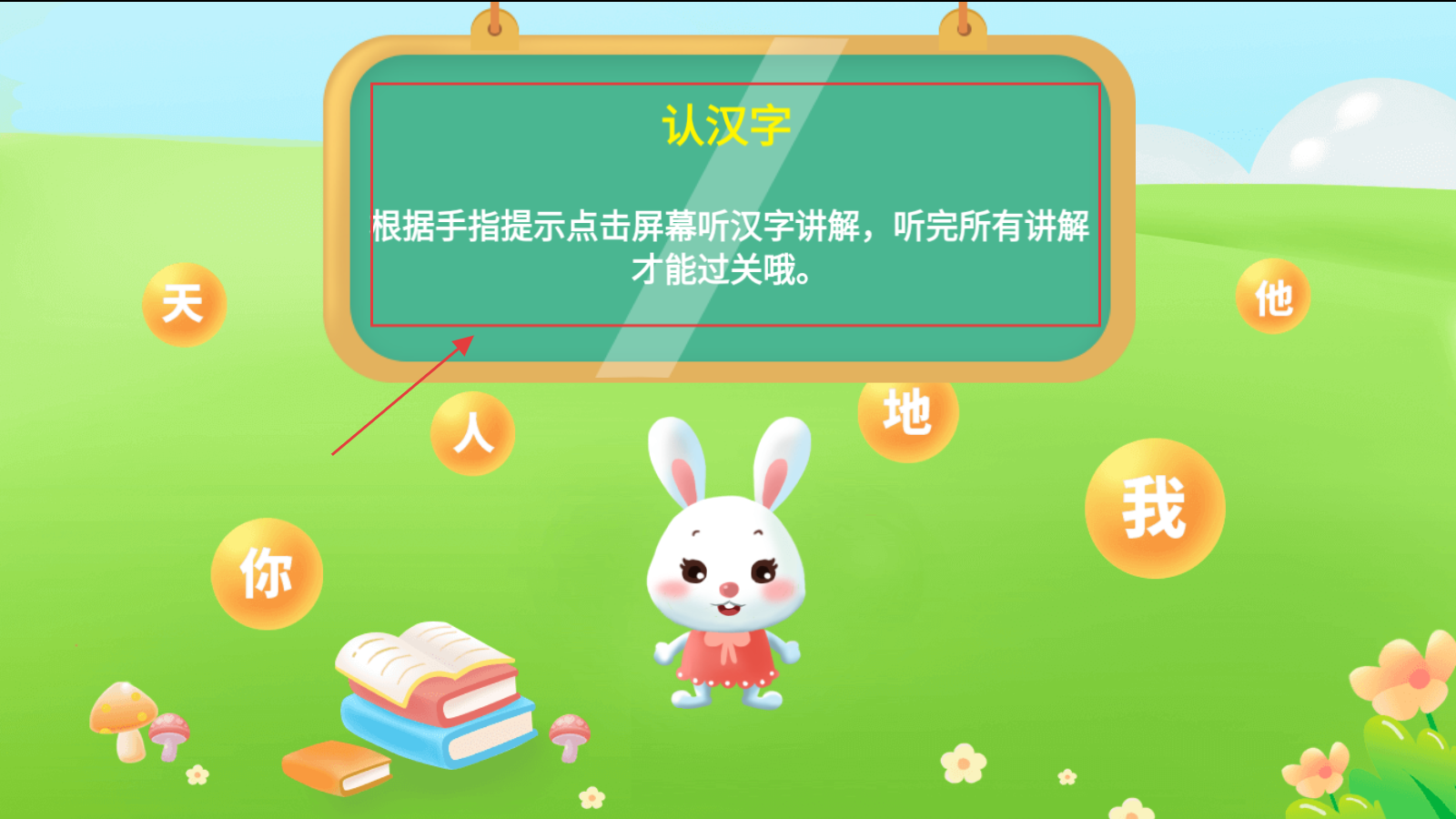 3、进入认汉字环节,按提示点击屏幕,听汉字讲解,听完所有内容完成闯关。